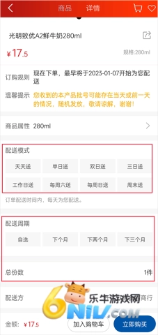 4、选定牛奶后,调整配送模式、周期和数量,点击立即购买,轻松搞定;