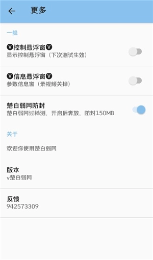 3、在此处将“楚白弱网防封”这一选项打开就行,过检测开启后可尽情使用,具备150MB的防封能力。