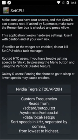SetCPU是一款极为强大的手机性能测试利器,借助它能够清晰查看手机CPU的实际使用状况,还能精准测试帧率的变化情况,在众多不同品牌与型号的手机上都能适用。值得一提的是,使用SetCPU无需获取root权限,用户可以依据自身需求对手机的各项参数进行个性化调控。要是您有相关需求,那就快来选择SetCPU吧!