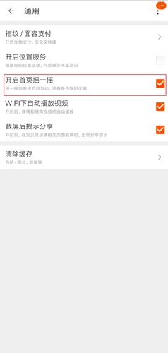 3、当进入“通用页面”后,点击“开启首页摇一摇”按钮,待其后的勾选变为橙红色即可。