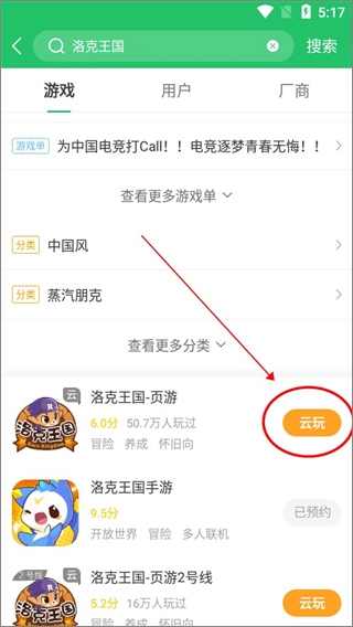 3、可以看到关于洛克王国页游的信息,点击“云玩”即可。