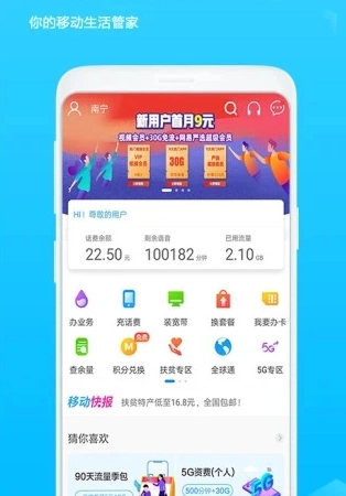 话费、流量、账户余额、账单信息等均可随时查询,流量包、大流量套餐、宽带业务等支持一键办理。