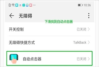 2、进入系统设置后,找到“自动点击器”,并点击进去,选择开启选项。