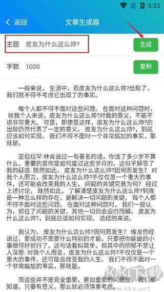 6、使用文章生成器时,仅需输入主题与字数,就能一键生成篇幅较长的文章,而且它的功能相当丰富!