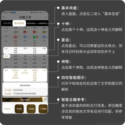 为注册用户提供云数据储存功能,可将用户数据保存到云端数据库。同时允许用户以游客身份使用,但不享有云数据储存功能;另有断事笔记功能,方便用户随时随地记录客户的命理信息。