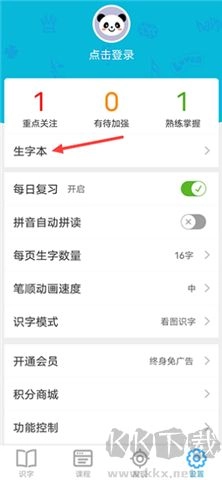 1、打开软件,进入后点击设置界面,接着点击“生字本”。