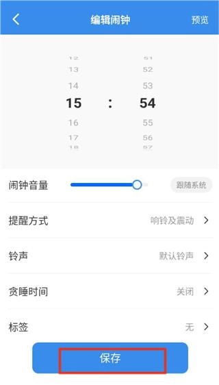 3、完成权限授予后,设置好闹钟的提醒方式、铃声以及贪睡时间,点击保存即可成功添加闹钟
