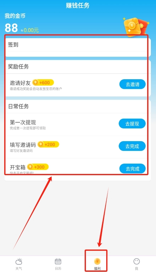 3、在软件指定区域点击签到,完成签到任务后,就能获取相应奖励,实现轻松赚钱。