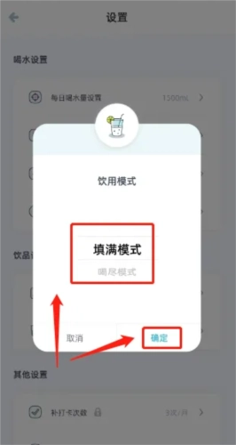 4、进入饮用模式,选择想要修改的模式,最后点击【确定】,即可成功修改