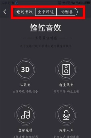 4、可以看到顶部的菜单选项,能够选择蝰蛇音效全景环绕以及均衡器