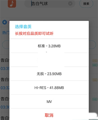 2、找到并点击你想要试听的歌曲,长按该歌曲后选择对应的音质选项,就能进行试听了。