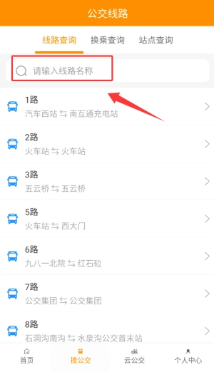 2、通过线路编号或站点名称搜索目标公交,系统将显示匹配的线路列表。
