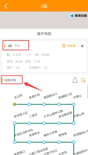 3、选定具体线路后,就能查看该线路的完整走向图、所经停靠站点以及首末班时间等运营相关信息。