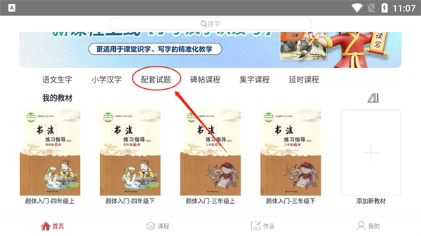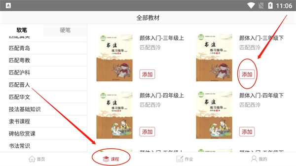 1、登录方正书法教师端后,点击课程板块,接着选择对应的教材完成添加操作;