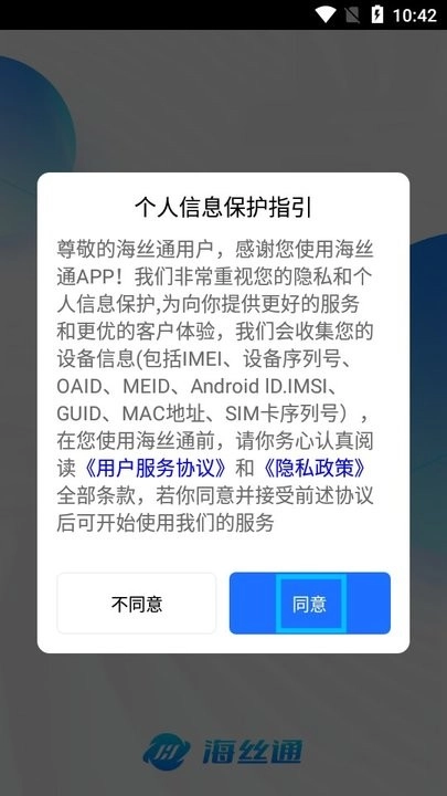 在本站安卓网打开海丝通,阅读弹出的个人信息保护指引后,点击【同意】按钮。