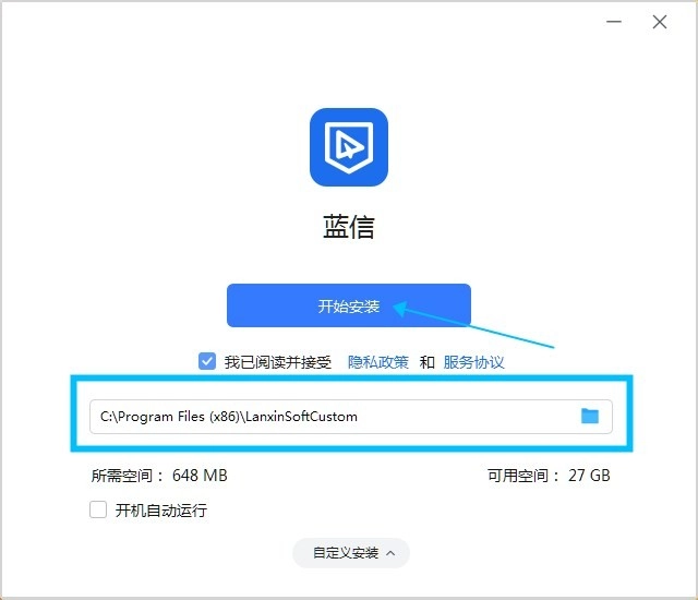 ·勾选【我已阅读并接受】,点击【自定义安装】