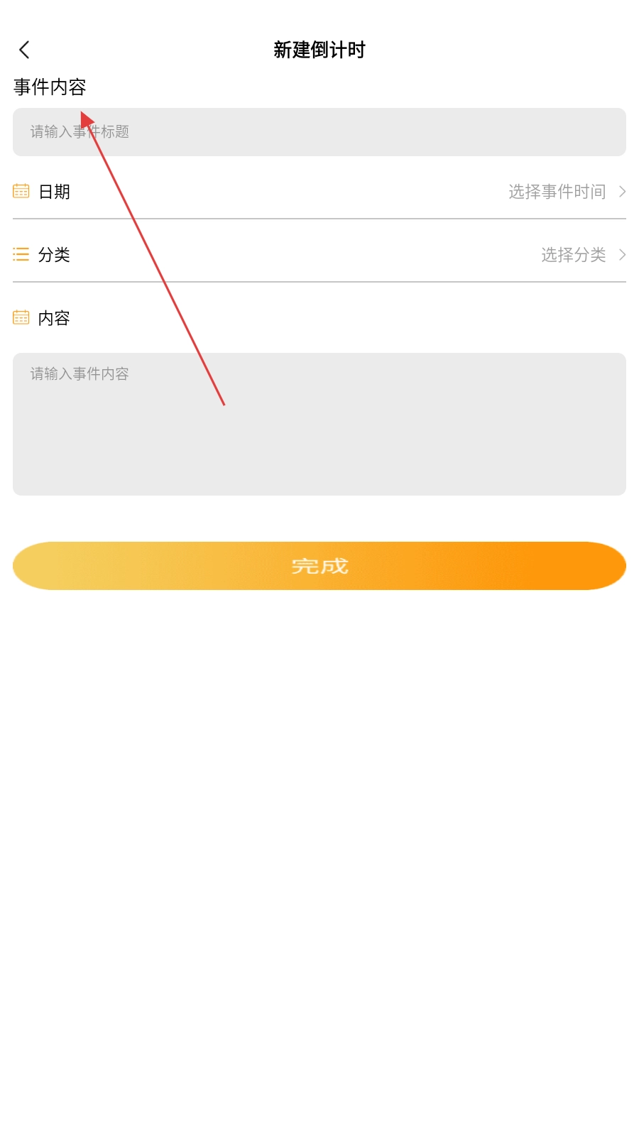 4、进入新建倒计时页面,依次填写事件标题、日期等相关信息,之后点击完成按钮即可。